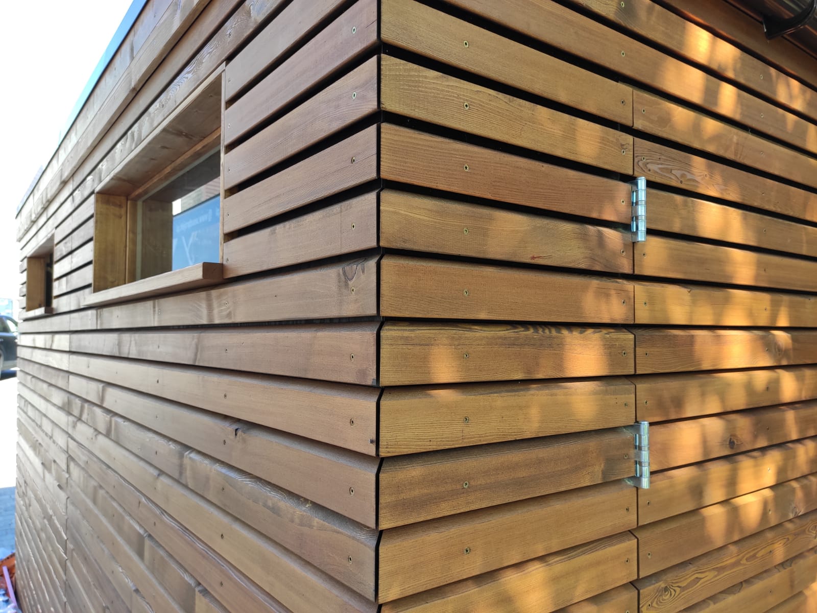 Domek narzędziowy wykończony deską modrzewia syberyjskiego- romb