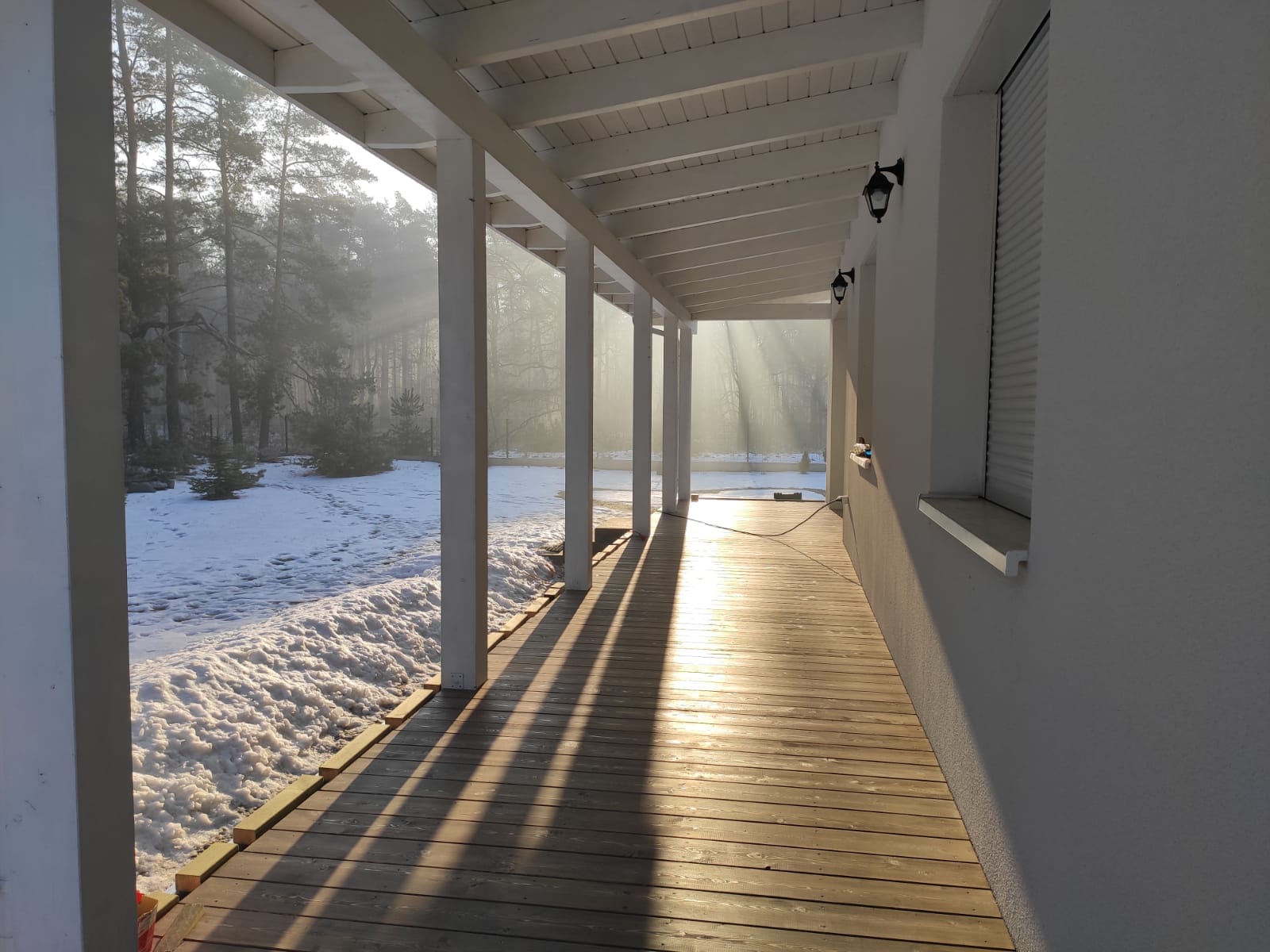 Dwa tarasy z białymi balustradami: jeden na konstrukcji aluminiowej, drugi na konstrukcji z drewna skandynawskiego. Pokrycie wykonane drewnem modrzewia syberyjskiego.
