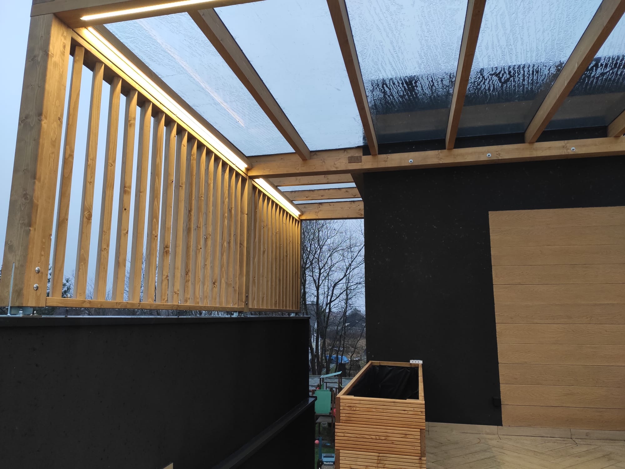 Pergola nad istniejącym tarasem, ścianki z ruchomymi lamelkami