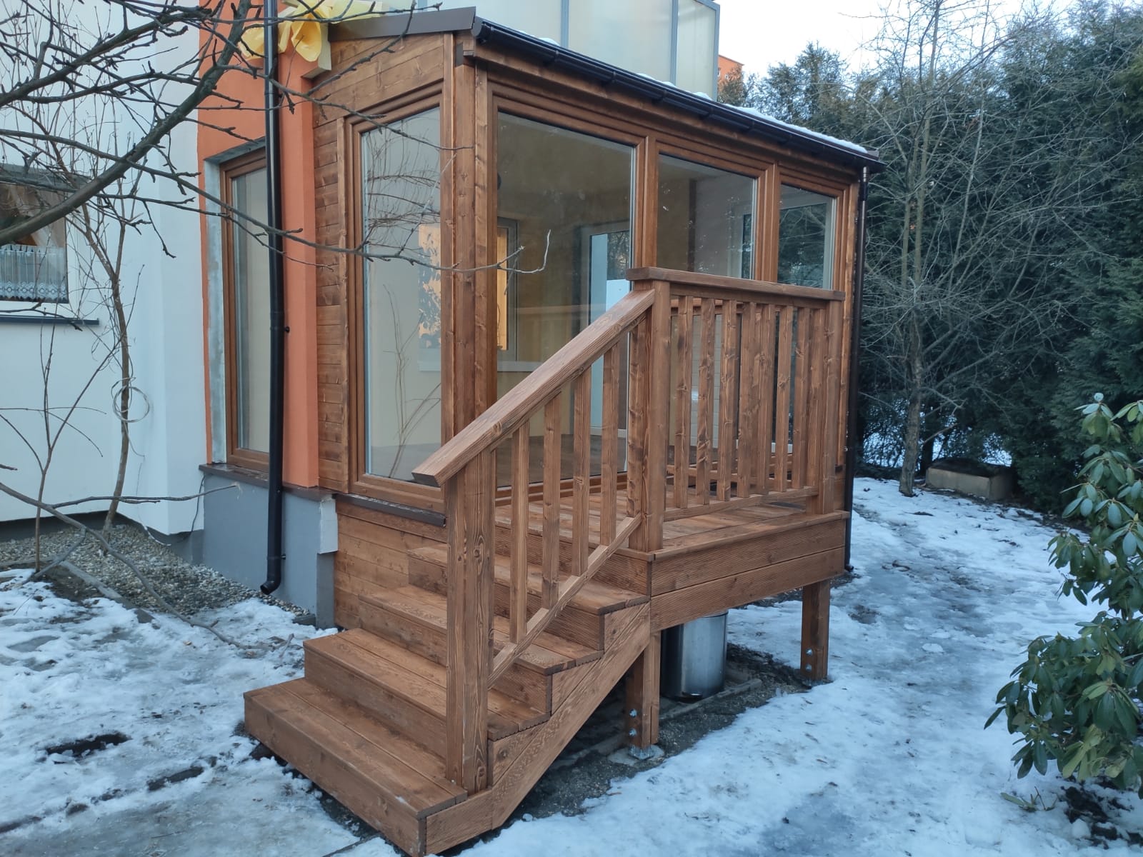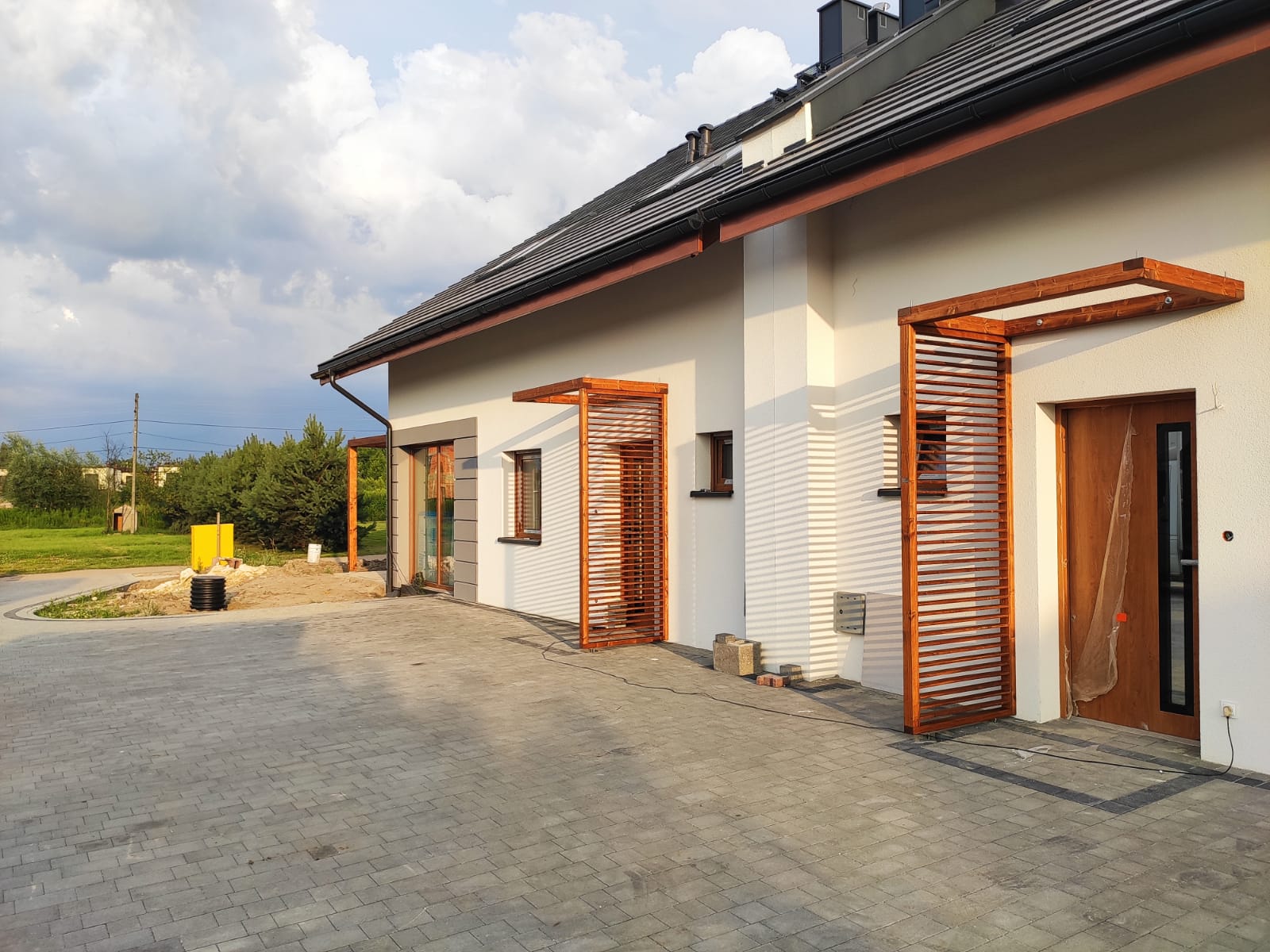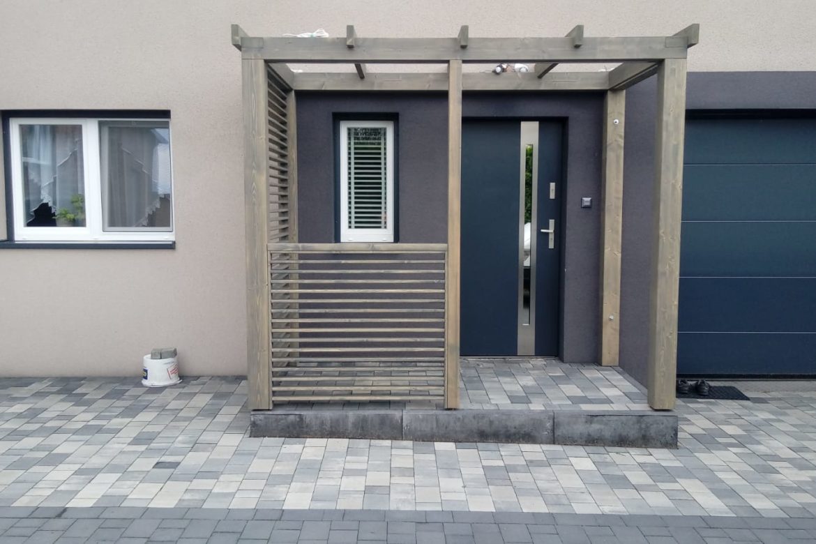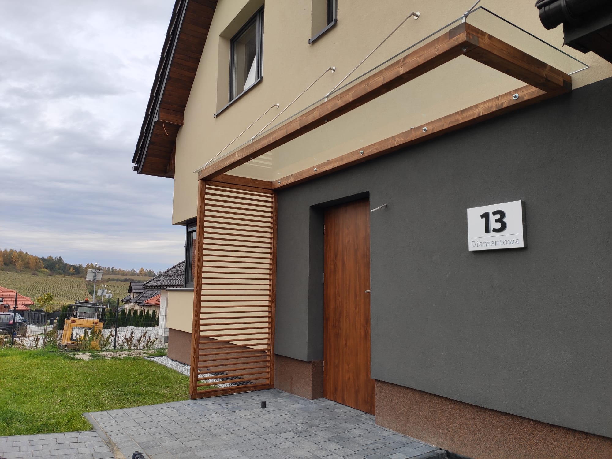 Szklane zadaszenie wyjścia do domu z drewnianą ścianką